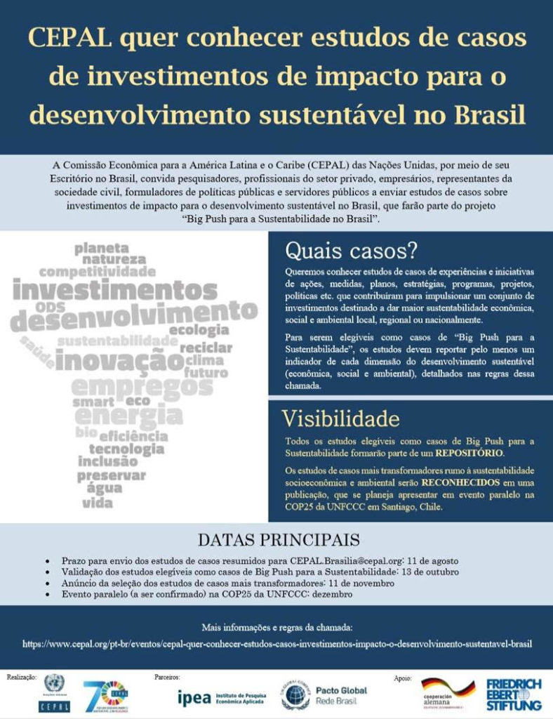 A Comissão Econômica para a América Latina e o Caribe (CEPAL) das Nações Unidas, por meio de seu Escritório no Brasil, convida pesquisadores, profissionais do setor privado, empresários, representantes da sociedade civil, formuladores de políticas públicas e servidores públicos a enviar estudos de casos sobre investimentos para o desenvolvimento sustentável no Brasil, que farão parte do projeto “Big Push para a Sustentabilidade no Brasil”.