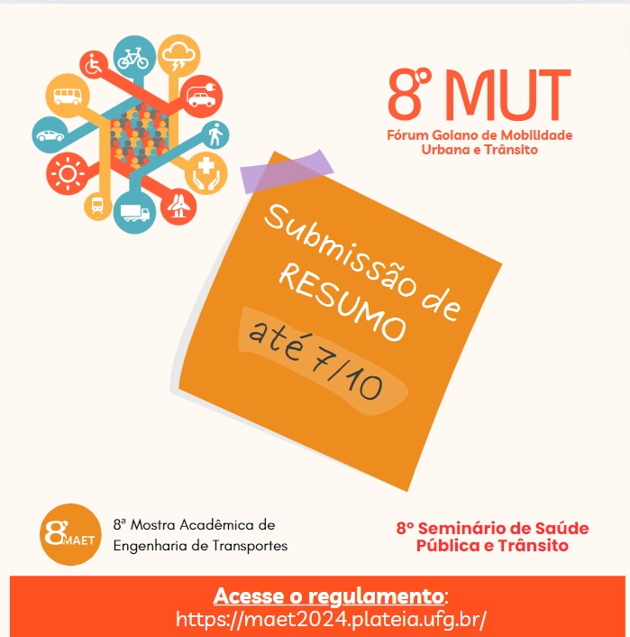 Em 2024, com o tema (In)Segurança Climática e Saúde: Repensar o Transporte no Ambiente Urbano, ocorre a integração dos três eventos: o Fórum Goiano de Mobilidade Urbana e Trânsito (MUT), a 8ª Mostra Acadêmica de Transportes (MAET) e o 8º Seminário de Trânsito e Saúde Pública. O objetivo é fortalecer o alinhamento entre mobilidade, transporte e saúde, reconhecendo que a colaboração entre esses setores é essencial para enfrentar os desafios contemporâneos no deslocamento das pessoas e das mercadorias, assim como em unir esforços para desenvolver soluções inovadoras e promover um desenvolvimento urbano saudável e inclusivo.