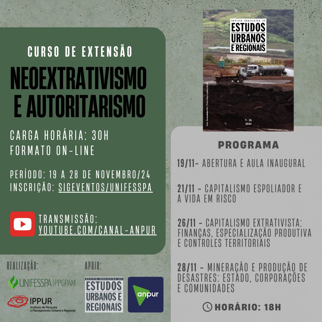 Inscrições abertas para o curso de extensão “Neoextrativismo e Autoritarismo” que será realizado, de forma remota, em quatro sessões nos dias 19, 21, 26 e 28 de novembro, sempre às 18h. A iniciativa é do Instituto de Pesquisa e Planejamento Urbano e Regional da Universidade Federal do Rio de Janeiro (IPPUR/UFRJ) e do Programa de Pós-graduação em Planejamento e Desenvolvimento Urbano e Regional na Amazônia da Universidade Federal do Sul e Sudeste do Pará (PPGPAM/UNIFESSPA), com apoio da Revista Brasileira de Estudos Urbanos e Regionais (RBEUR) e da ANPUR.