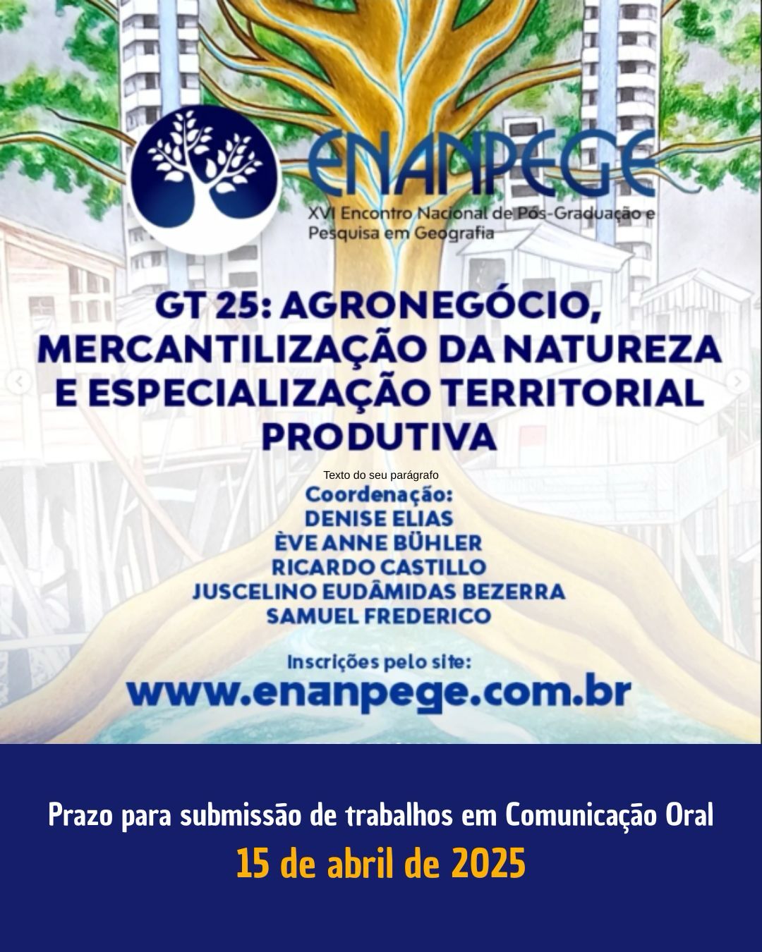 As inscrições para apresentação de trabalhos em Comunicação Oral e Relato de Experiência foram prorrogadas até 30 de abril de 2025. Para saber mais, acesse: www.enanpege.com.br