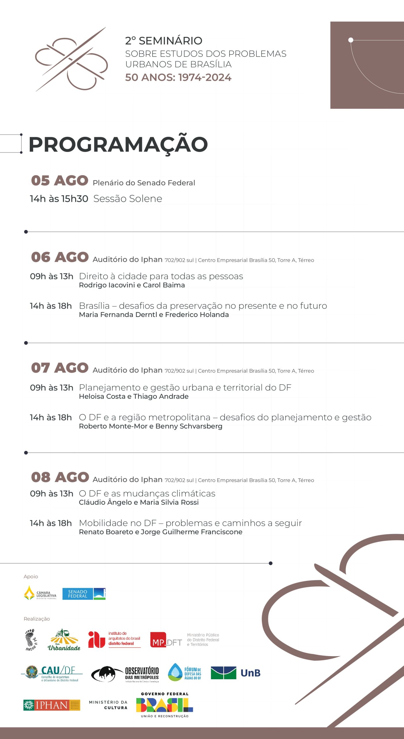Com o objetivo de debater os problemas urbanos da atualidade no Distrito Federal, o seminário contará com a presença de especialistas no assunto que vão abordar o direito à cidade, os desafios do planejamento e gestão urbana e territorial do DF até como a capital deve enfrentar as mudanças climáticas.