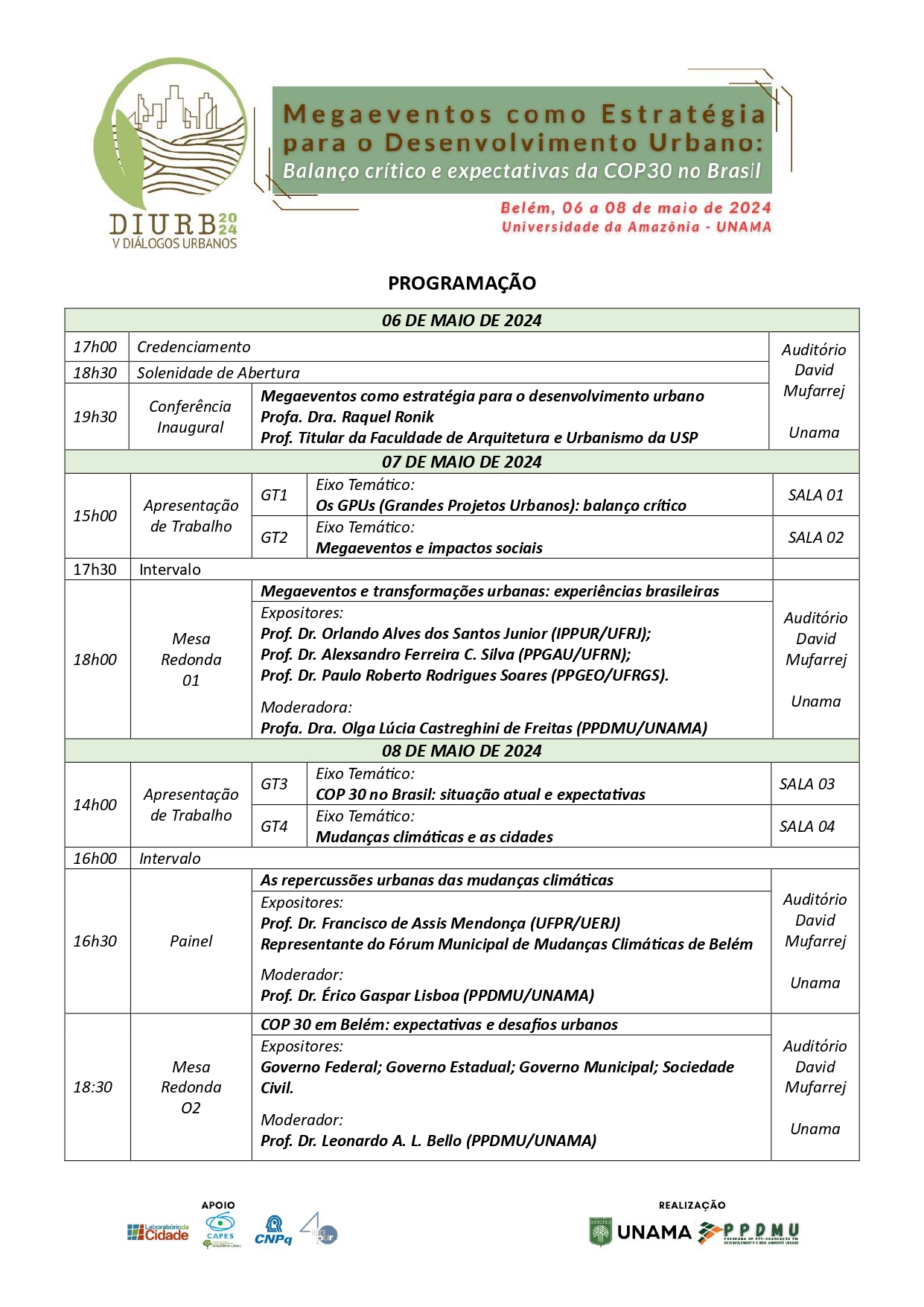 O Programa de Pós-Graduação em Desenvolvimento e Meio Ambiente Urbano (PPDMU) da Universidade da Amazônia (UNAMA) e o Laboratório da Cidade – Belém convidam para inscrições e submissões de resumos expandidos no V DIÁLOGOS URBANOS – Megaeventos como estratégia para o desenvolvimento urbano: balanço crítico e expectativas da COP30 no Brasil – DIURB’24, que será realizado em Belém (PA), entre 06 e 08 de maio de 2024.