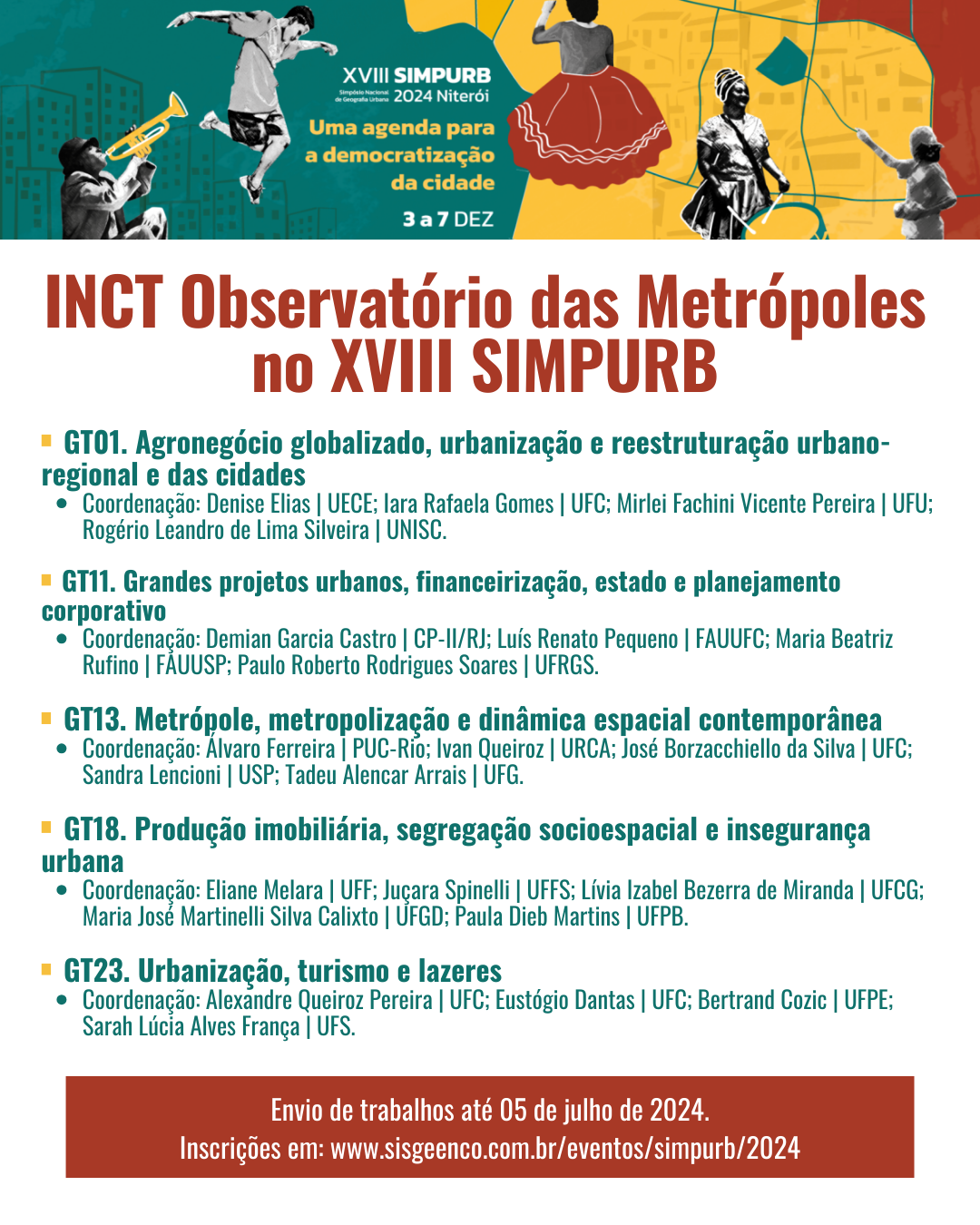 A submissão de trabalhos para um dos 23 Grupos de Trabalho (GTs) do evento pode ser realizada até o dia 05 de julho de 2024, através da Plataforma SISGEENCO. Integrantes do INCT Observatório das Metrópoles participam da coordenação de GTs do XVIII SIMPURB. Confira: