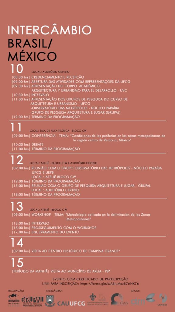Ocorrerá entre os dias 10 a 15 de junho, na Universidade Federal de Campina Grande (UFCG), o projeto “Intercâmbio Brasil México“, com a presença das professoras Drª Noemi Guerrero e Drª María Concepción Chong do departamento de Arquitetura e Urbanismo da Universidade Veracruzana.