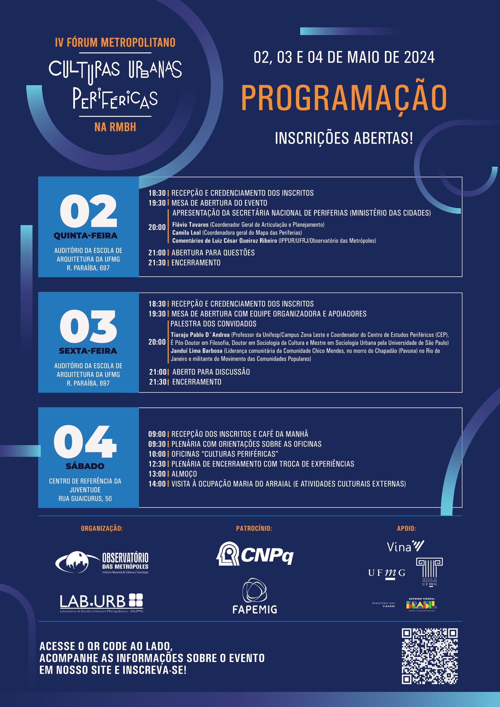 A 4ª edição do fórum é dedicada à reflexão das CULTURAS URBANAS PERIFÉRICAS NA RMBH. O evento contará com uma programação de três dias, incluindo palestras e oficinas temáticas que discutirão projetos governamentais, iniciativas de movimentos sociais, vivências e experiências do cotidiano das culturas urbanas periféricas.