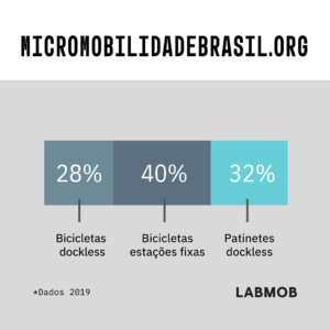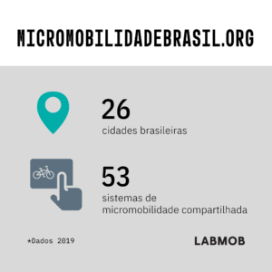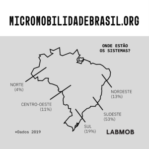 Em 2019, a plataforma mapeou ao todo 53 sistemas públicos de micromobilidade compartilhada no Brasil, distribuídos em 26 cidades diferentes. Cerca de 50% desses sistemas encontram-se na região Sudeste do país, principalmente por conta da relevância do Estado de São Paulo em concentrar 28% de todos os sistemas brasileiros. Em seguida, 19% dos sistemas ficam no Sul, 13% no Nordeste, 11% no Centro-Oeste e apenas 4% (2 sistemas) no Norte. A maior parte (68% – 36 de 53) dos sistemas de micromobilidade era de bicicletas regulares do tipo dockless (28% – 15 de 53) ou com estação (40% – 21 de 53), e 32% (17 de 53) eram de patinetes dockless.