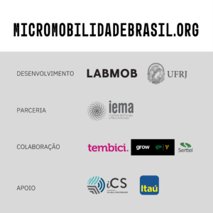 MicromobilidadeBrasil.org é um projeto coordenado pelo Laboratório de Mobilidade Sustentável (LABMOB), da Universidade Federal do Rio de Janeiro (UFRJ), com a parceria do Instituto Energia e Meio Ambiente (IEMA) e apoio do Instituto Clima e Sociedade (ICS) e do Itaú Unibanco. Também foi estabelecida uma colaboração com as operadoras Tembici, Grow (Grin + Yellow) e Serttel, que forneceram todos os dados relativos aos sistemas.
