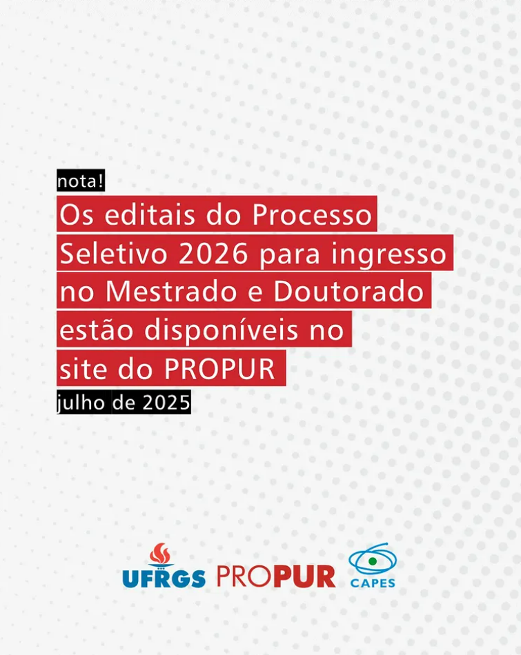 O Programa de Pós-graduação em Planejamento Urbano e Regional da Universidade Federal do Rio Grande do Sul (PROPUR/UFRGS) divulgou os editais dos Processos Seletivos de Mestrado Acadêmico e Doutorado para ingresso em 2026. Trata-se de um programa historicamente consolidado na área de Planejamento Urbano e Regional, com inserção internacional e excelência acadêmica.