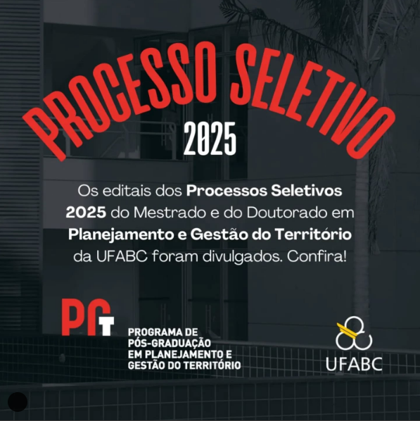 Inscrições abertas entre 1º de fevereiro e 02 de março de 2025 para os cursos de Mestrado e Doutorado no Programa de Pós-Graduação em Planejamento e Gestão do Território da Universidade Federal do ABC (PPGPGT/UFABC). O início das aulas está previsto para junho de 2025.