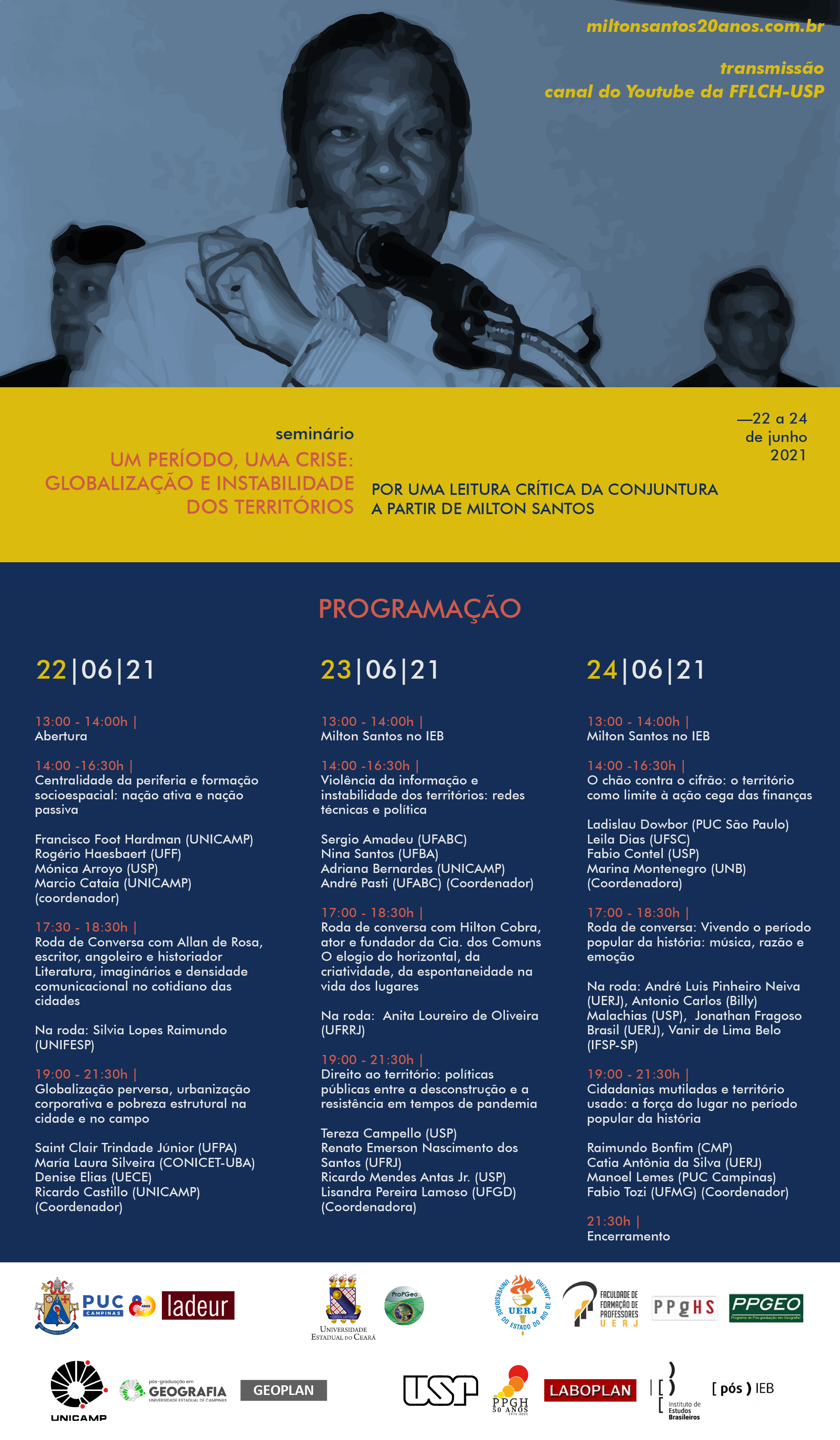 Entre os dias 22 e 24 de junho será realizado o Seminário Um período, uma crise: globalização e instabilidade dos territórios — por uma leitura crítica da conjuntura a partir de Milton Santos. O evento, que ocorrerá no formato online, reverencia a obra do geógrafo baiano passados 20 anos do seu falecimento.
