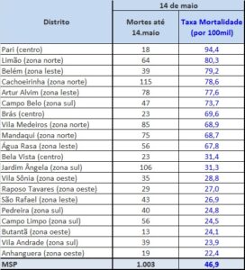 Tabela 4 – Número e Óbitos e Taxa de Mortalidade. Seleção de Distritos. 14 de maio de 2020.