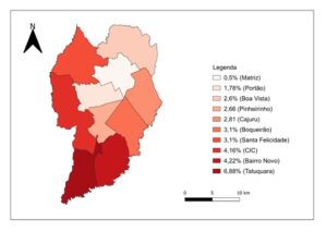 Mapa 2 – Distribuição territorial por distrito sanitário dos diagnósticos de Síndrome Gripal (SG) em relação à população atendida.