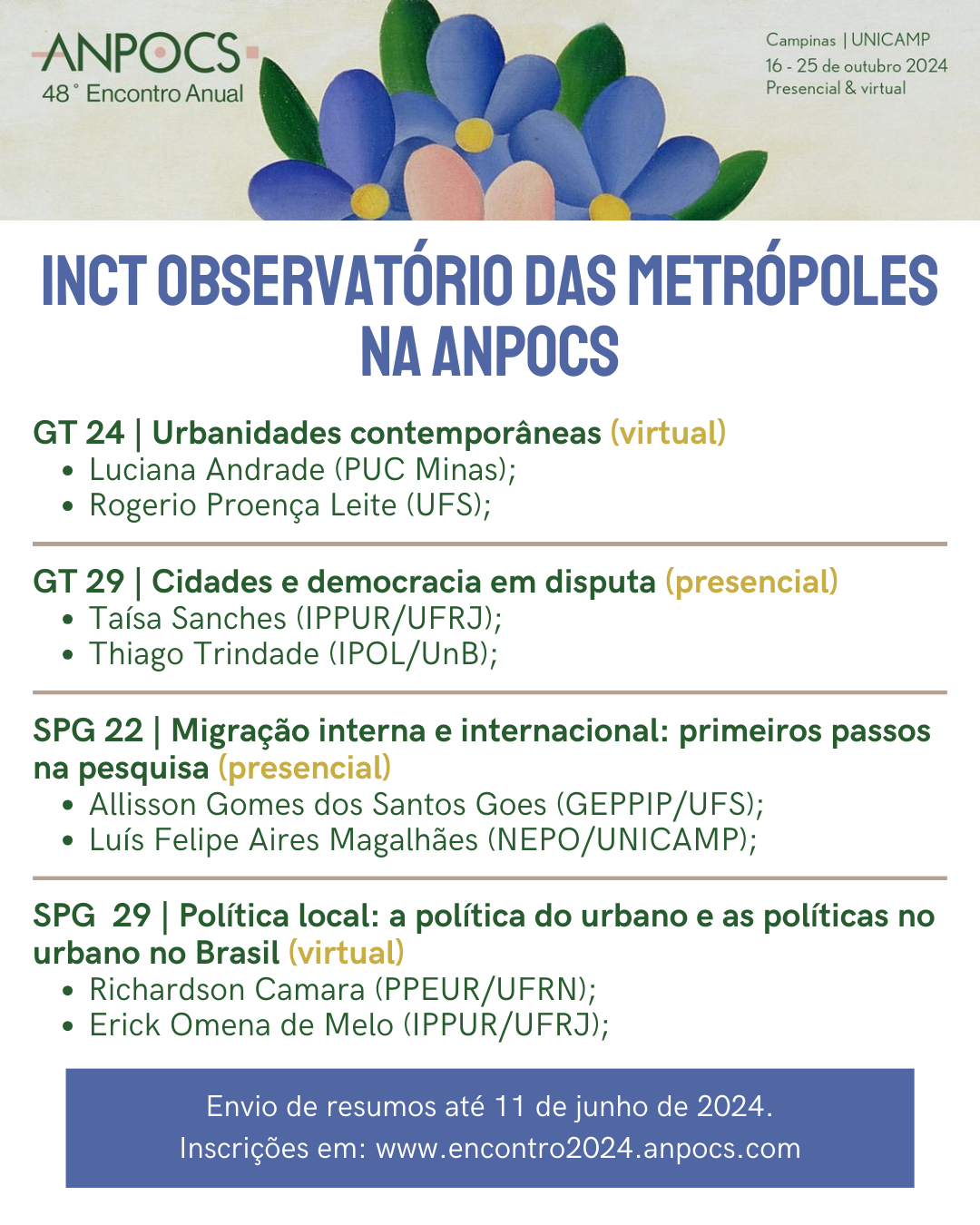 Até o dia 11 de junho é possível submeter resumos para participar de Simpósios de Pesquisas Pós-Graduadas (SPGs) ou Grupos de Trabalho (GTs), conforme normas do edital (clique aqui). Pesquisadores(as) do INCT Observatório das Metrópoles participarão como coordenadores de GTs e SPGs durante o evento. Confira: