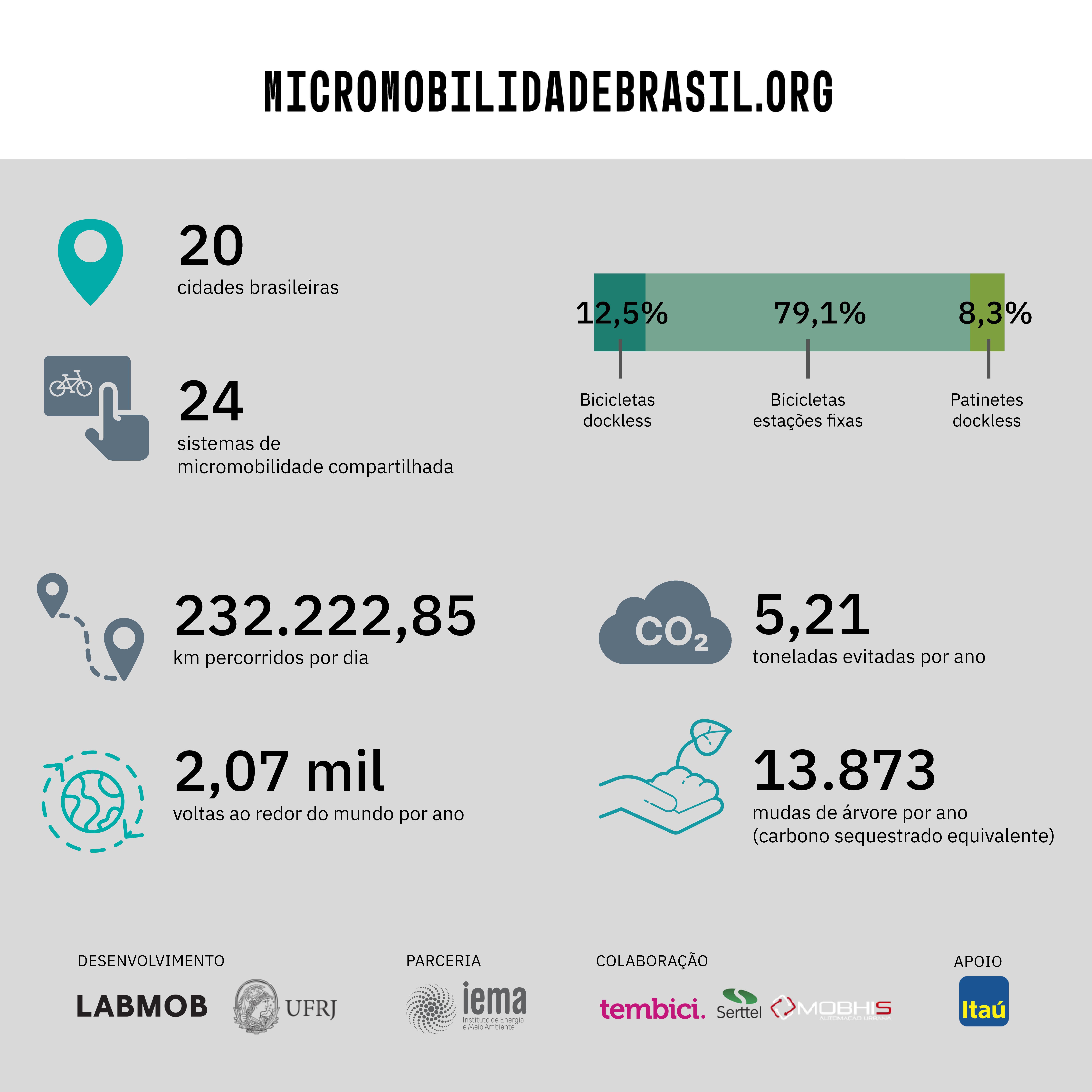 MicromobilidadeBrasil.org é um projeto coordenado pelo Laboratório de Mobilidade Sustentável (LABMOB) da Universidade Federal do Rio de Janeiro (UFRJ), com apoio do Instituto Clima e Sociedade (ICS) e do Itaú Unibanco e realizado em parceria com o Instituto de Energia e Meio Ambiente (IEMA). Também contamos com a colaboração das operadoras Tembici, Serttel e Mobhis.
