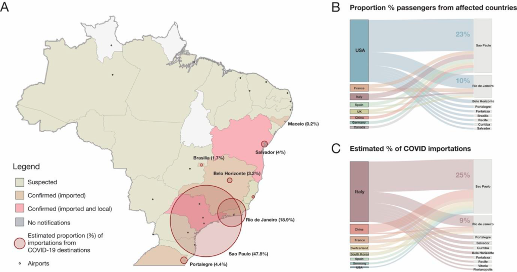 Os autores destacam, no entanto, que por ser a primeira do mundo globalizado, a pandemia da COVID-19 inclui interações espaciais para além das de natureza territorial, como as interações espaciais imateriais (tecnologias de informação e comunicação), resultando em um plano de difusão que potencializa os seus riscos.