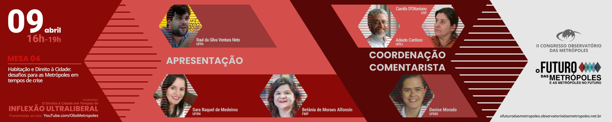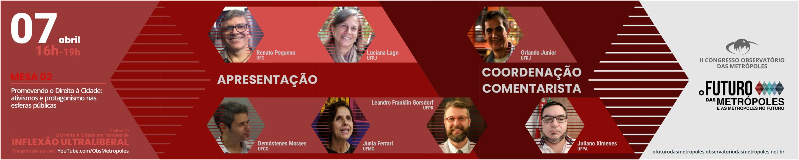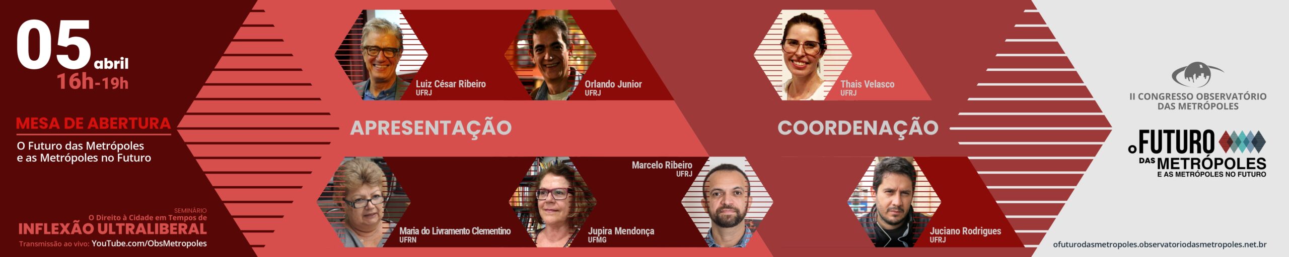Em 2020 houve uma inflexão profunda nas dinâmicas urbanas e regionais. Além das desigualdades já conhecidas nas periferias do mundo, como o caso do Brasil, ampliou-se algumas problemáticas decorrentes da crise sanitária-econômica-social imposta pela pandemia. O INCT Observatório das Metrópoles, reunindo suas experiências acadêmicas, propõe um seminário que discuta as questões previamente dispostas nos contextos metropolitanos à luz dessa nova perspectiva de organização social e urbana. Qual o futuro das metrópoles e como se desenharão as metrópoles no futuro? A mesa de abertura do evento, que faz parte do II Congresso do Observatório das Metrópoles, tem por objetivo discutir esses temas e refletir sobre as perspectivas de futuro.