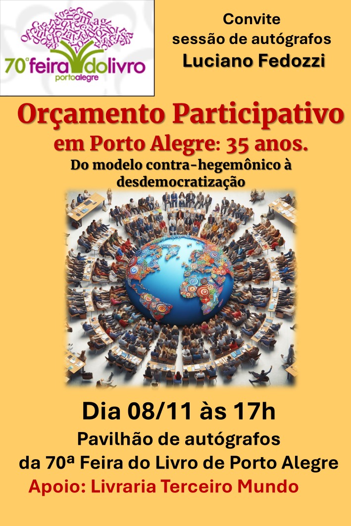 O Núcleo Porto Alegre do INCT Observatório das Metrópoles convida para a sessão de autógrafos do livro “Orçamento Participativo de Porto Alegre: 35 anos“, de autoria do pesquisador Luciano Fedozzi. O livro apresenta o resultado de pesquisas relativas ao tema da gestão democrática das cidades, como um requisito da agenda da reforma urbana e do direito à cidade no país.