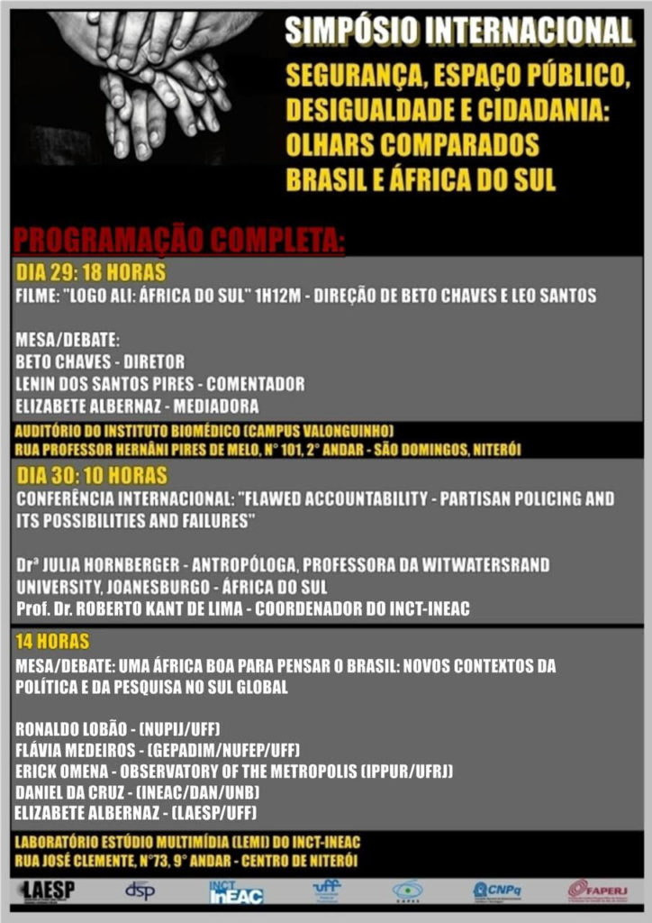 Ocorrerá entre os dias 29 e 30 de outubro, na Universidade Federal Fluminense (UFF), o Simpósio Internacional sobre segurança pública e cidadania no Brasil e África do Sul. O evento contará com a participação de Erick Omena, pesquisador do Observatório da Metrópoles.